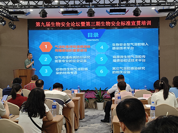 本次大会上,我们公司首席研发总监、原军事医学科学院高级工程师温占波博士就“微生物气溶胶感染技术平台特点及应用”进行了专题报告。本次报告主要围绕“平台设计及微生物气溶胶感染的特殊考虑”、“生物安全型气溶胶吸入感染技术平台”、“病原微生物气溶胶传播感染验证技术平台”等6个方面进行介绍与交流。